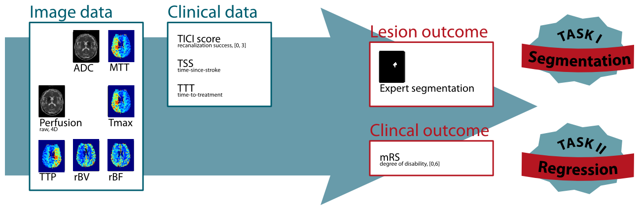 A public dataset of diverse ischemic stroke cases and a suitable automatic evaluation procedure will be made available. The provided data allows the participating methods to combine image and clinical information in any combination to achieve the tasks' goals.