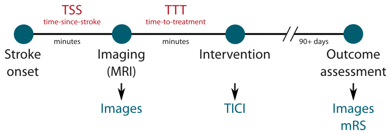 The typical stroke treatment procedure involves the acquisition of brain images at some time-since-stroke (TSS). Depending on the these and other factors a treatment decision is made and an intervention takes place after a time-to-treatment (TTT). The success of this intervention is assessed via the standardized TICI score. After the effects stabilized, the final clinical outcome is determined with the mRM and the final lesion outcome by brain imaging.